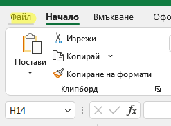 • Менюта и раздели: В горната част се намира лентата с различни раздели като Home, Insert, Page Layout, Formulas, Data, Review и View (Начало, Вмъкване, Оформление на страниците, Формули, Данни, Преглед, Изглед).